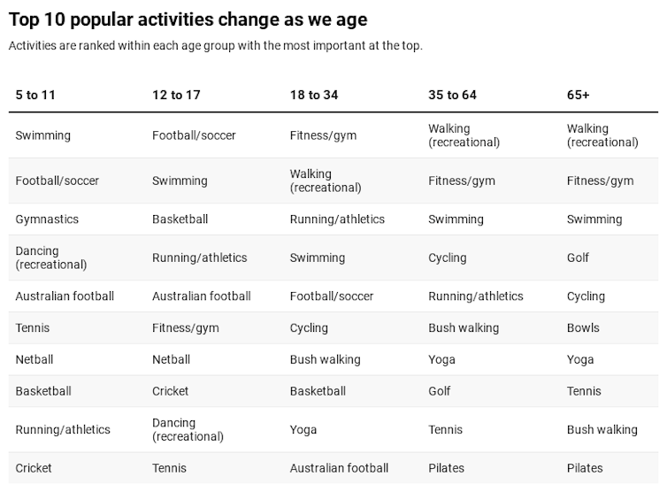 The activities with the highest participation by Australians of different age groups are shown in the table below. These findings show some obvious differences between age groups.