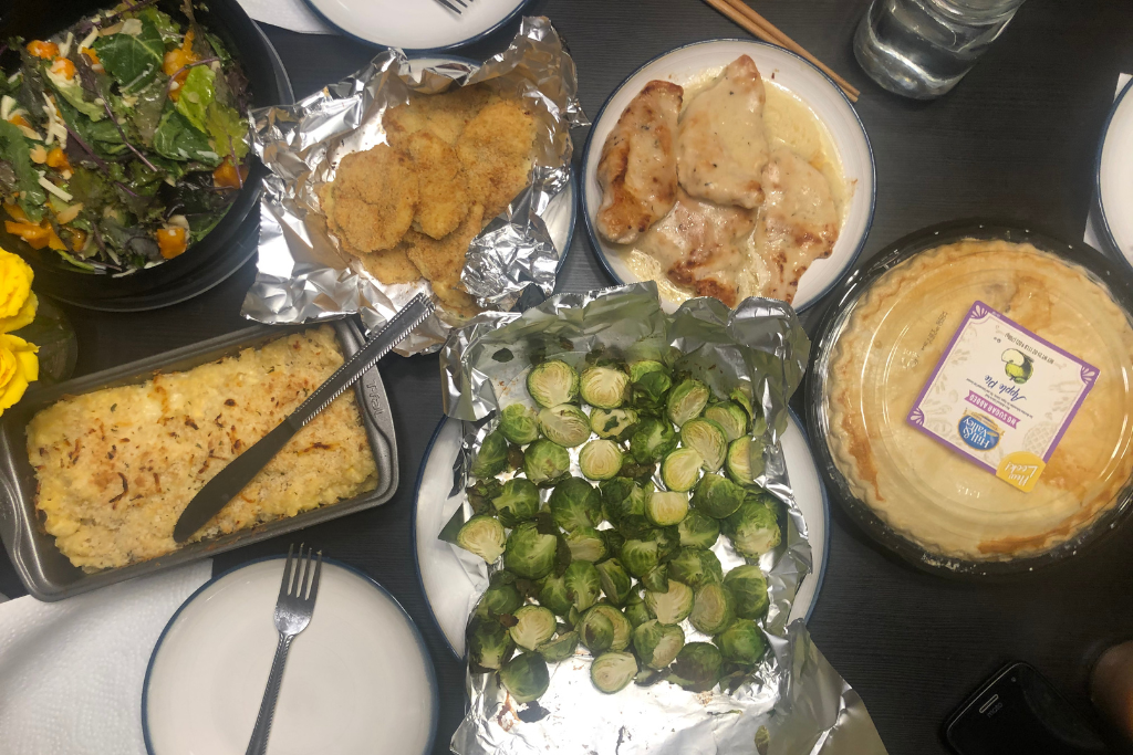 The third year was quite a different picture. The pandemic was raging on, and many students were not able to return home for Thanksgiving. Our university actually prepared care packages of ingredients for students to pick up and cook on their own. It came with some instructional videos prepared by campus chefs as well, which was actually a thoughtful touch. I remember prepping brussel sprouts, turkey breast, and some potato croquettes with my friends (the ones I spent my first Thanksgiving with). My Chinese friend also cooked up some lotus root with minced meat, giving it that true international inclusion.